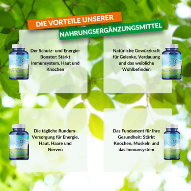 Wir haben eingesamte Produktlinie an Nahrungsergänzungsmitteln die in Kombination mit einer richtigen Ernährung und körperlicher Aktivität dazu beitragen, wiederherstellen Die gesunde Gewohnheiten die wir aufgrund von Stress und dem modernen Life oft vernachlässigen müssen.